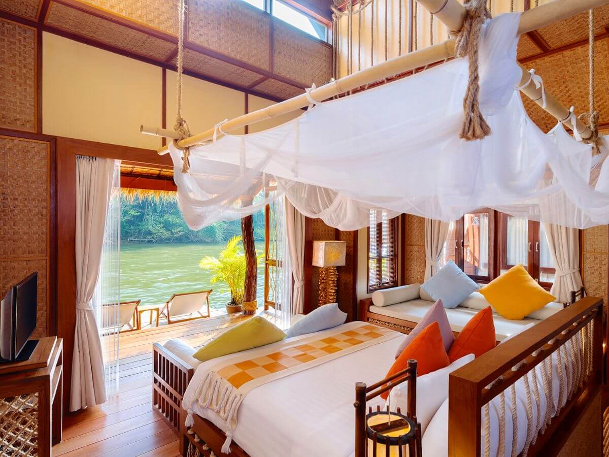 En las costas del río Kwai, en la provincia de Kanchanaburi en Tailandia, se encuentra uno de los hoteles flotantes más exóticos del mundo. Float House River Kwai tiene 18 elegantes villas hechas de bambú y madera de teca tradicional.