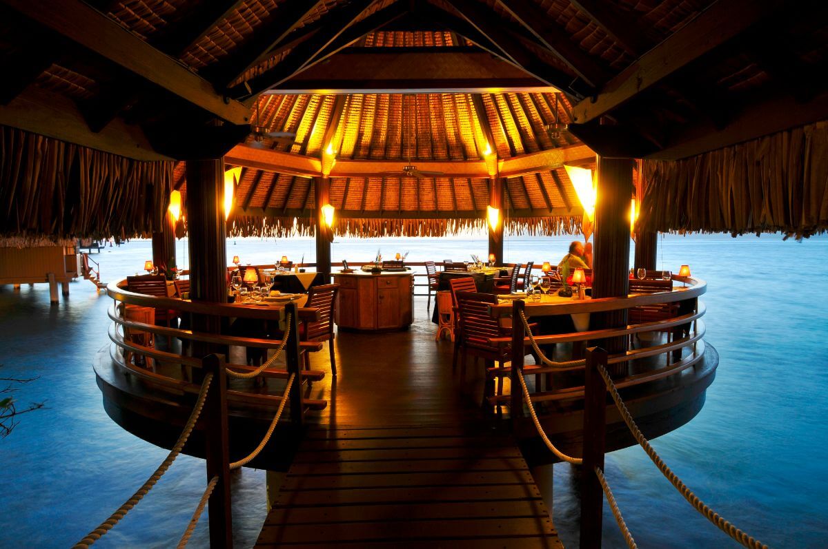 Las comidas y cenas en los restaurantes del hotel son parte muy importante de la experiencia. Aquí se puede cenar en un palafito sobre el agua, mientras se disfruta de espectáculos de música y bailes tradicionales de la Polinesia.